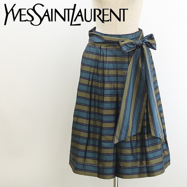 > ヴィンテージ◆Yves Saint Laurent イヴサンローラン シルク100% ラメ ボーダー柄 リボンベルト付 タック フレア スカート M
