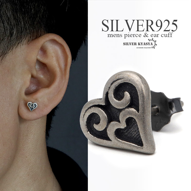 > ネイティブ ハートピアス シルバー925 メンズ スタッドピアス シルバー 唐草 燻 アンティーク 金属アレルギー対応 片耳 1点