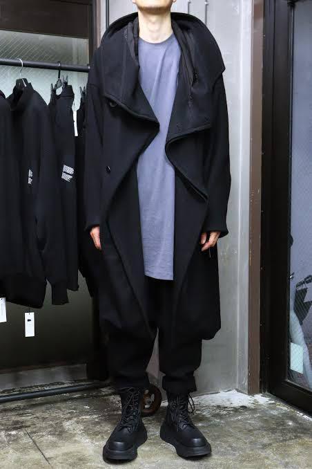 > ユリウス JULIUS 20ss メルトン ウール フード オーバーサイズ ラップ ロング コート 黒 3