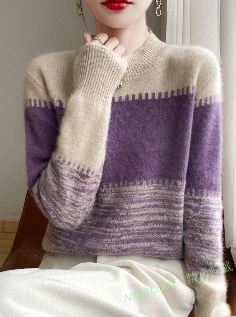 - ☆新品 秋冬オシャレ カシミヤ混ニットセーター高級感配色きれいめニットトップス着やせ暖かい可愛い大人長袖ショート丈パープル MK649