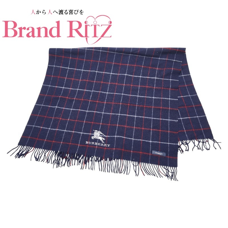 > 中古 バーバリー ブランケット チェック ロゴ刺繍 ネイビー ABランク ウール レディース BURBERRY 【送料無料】【名谷店】