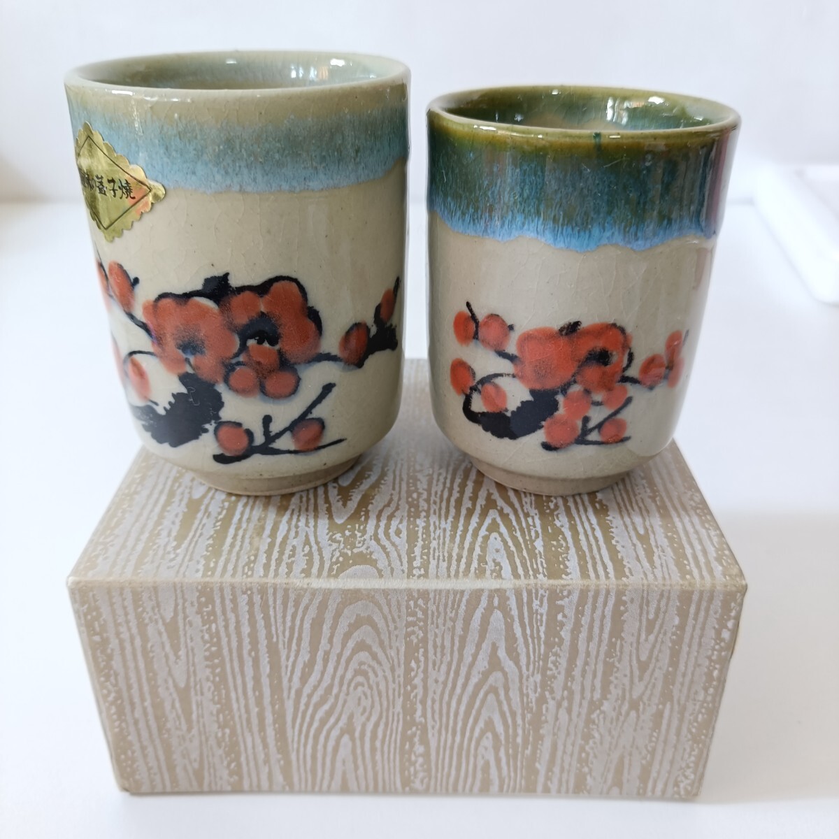- 益子焼 並白釉青掛紅梅文 夫婦湯呑 ペア 未使用品 [ 益子 和陶器 湯呑 湯飲み 民藝 日本美術]