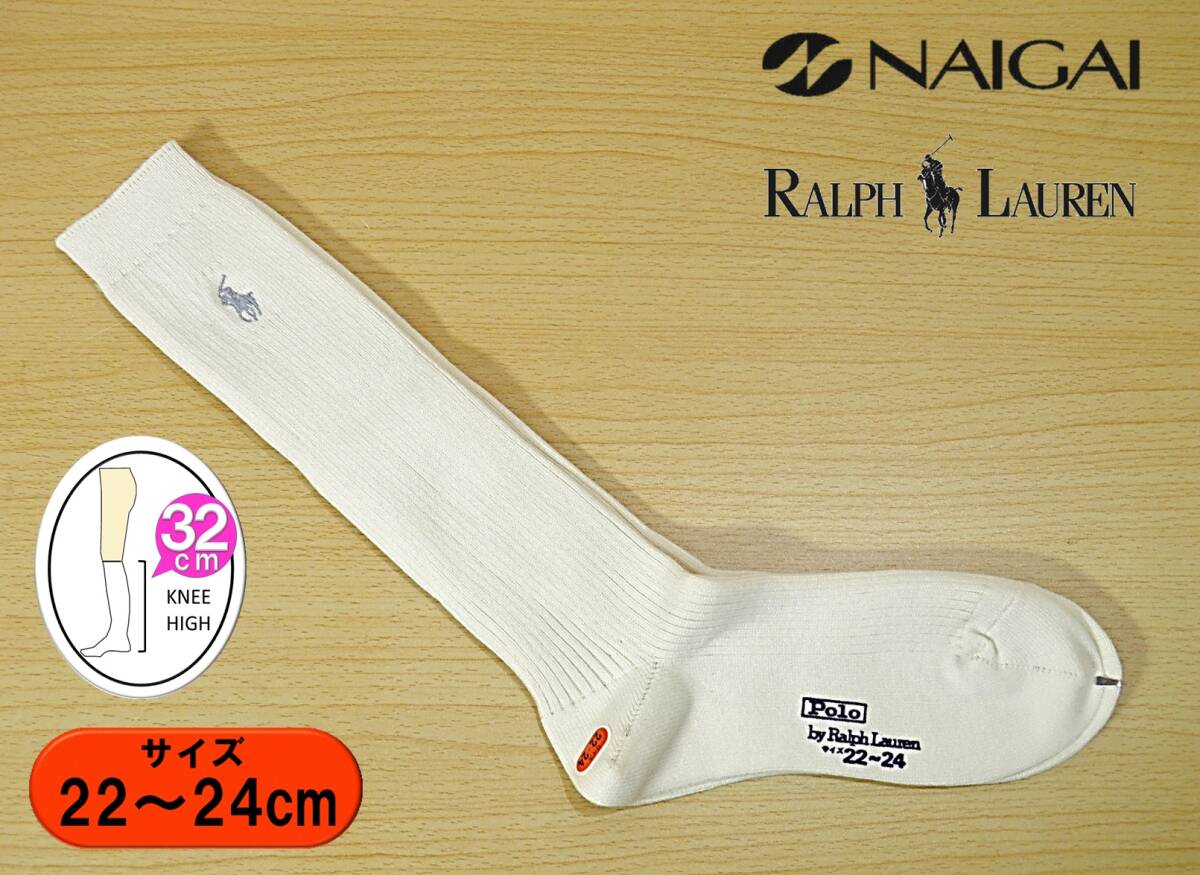 > 【レッグウェア★未使用品】NAIGAI◆Ralph Lauren◆白 ハイソックス◆ロゴ刺繍 スクールソックス◆22-24cm◆32cm丈◆OW