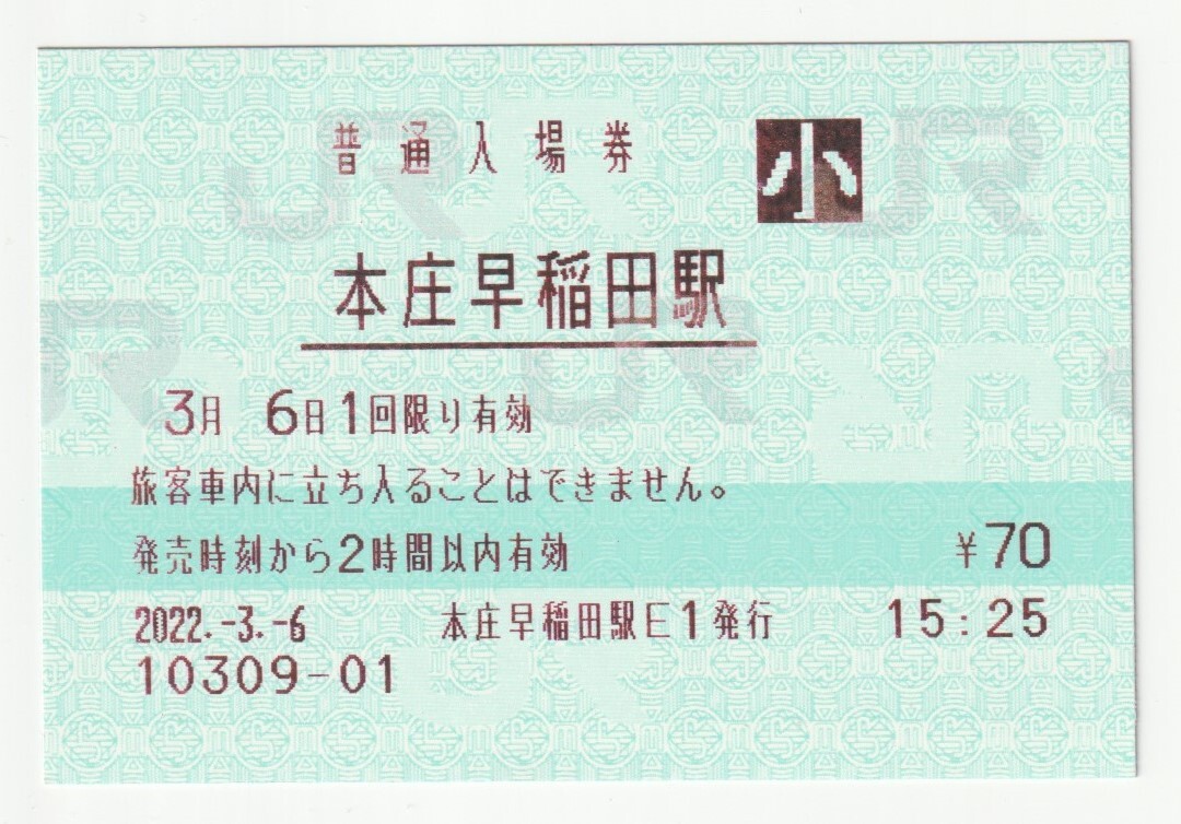 - 2022年3月6日 上越新幹線 本庄早稲田駅 70円小人普通入場券(マルス)