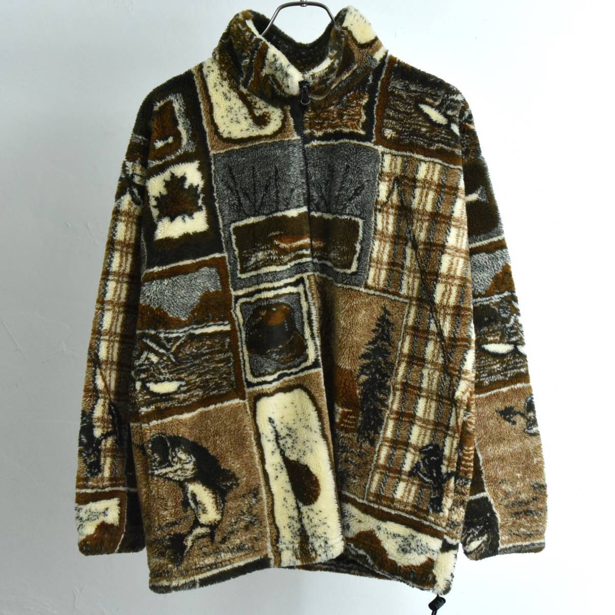 - デザイン◎ 90s USA製 MAZMANIA フィッシング柄 フェイクファー ジャケット ビンテージ 魚 アニマル フリース ハンティング