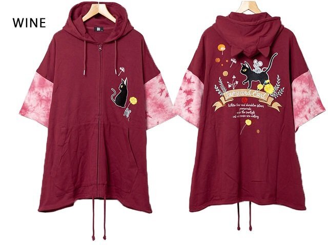 - ラミ&アール シロツメクサとたんぽぽの散歩道ドルマンジップパーカー◆LIN ワインMサイズ レディース AL-75749 黒猫 ネコ ネズミ 刺繍