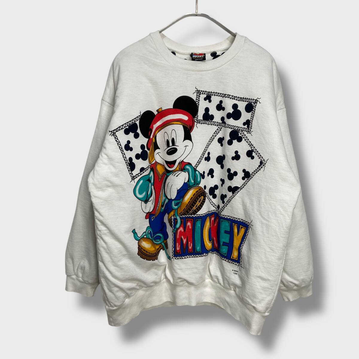 - 送料無料☆Disney☆90s☆USA製☆ミッキーマウス☆ディズニー☆プリントスウェット☆ダブルフェイス☆総柄☆ホワイト☆レディースL☆C25M