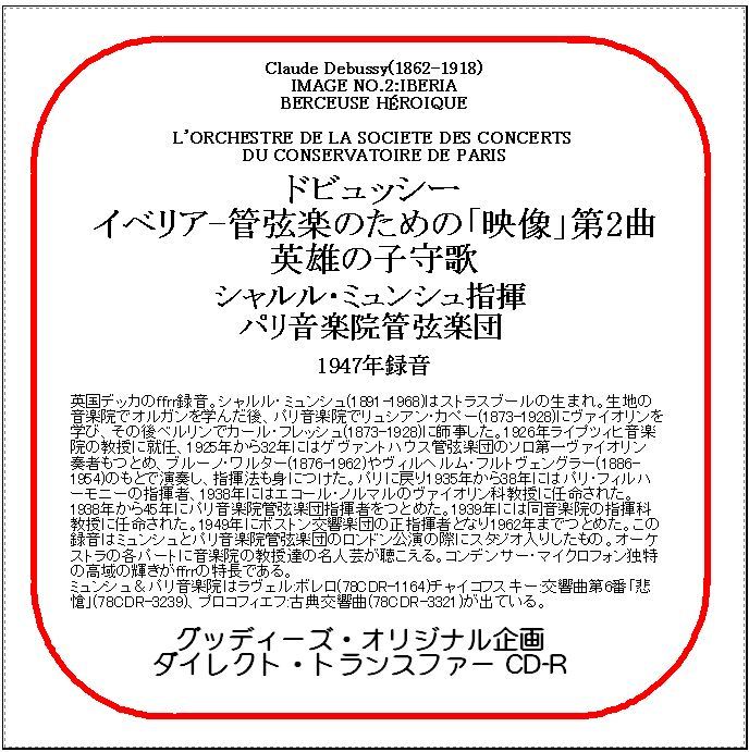 - ドビュッシー:イベリア-管弦楽のための「映像」/シャルル・ミュンシュ/送料無料/ダイレクト・トランスファー CD-R
