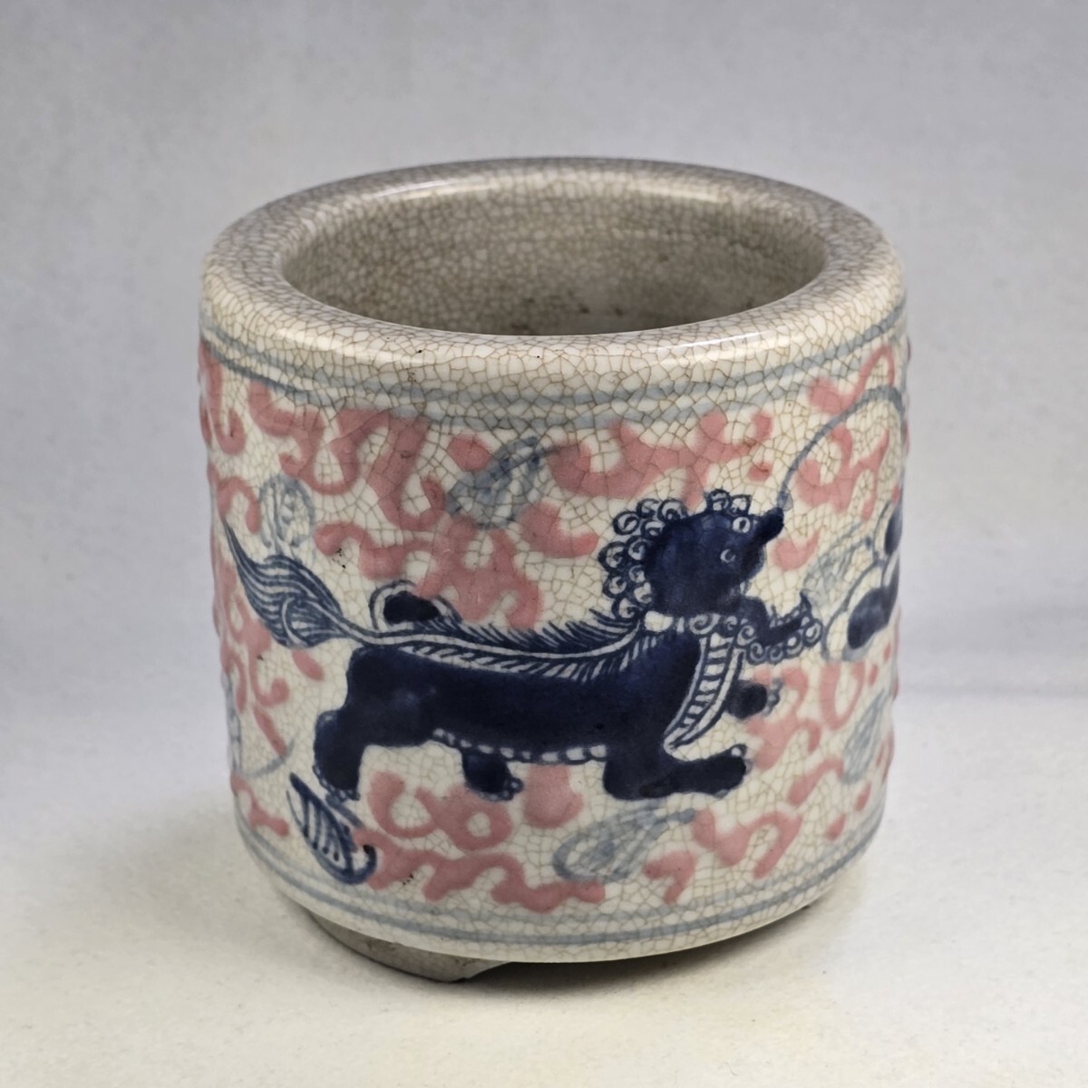 - 文房具 中国古磁 青花染付 釉里紅 手描き 麒麟紋 筆立て 筆洗 置物 美品