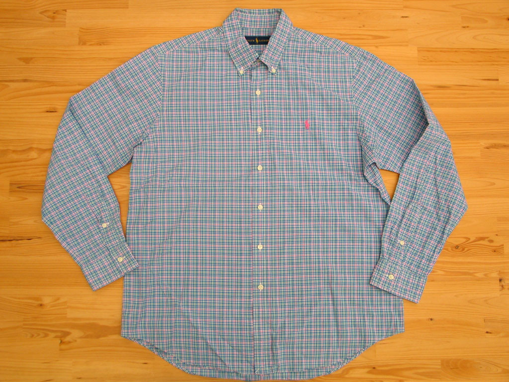 > ポロラルフローレン ブルー ピンク グリーン 白 マルチ 細かいチェック ボタンダウン長袖シャツ Lサイズ POLO RALPH LAUREN 薄手 美品