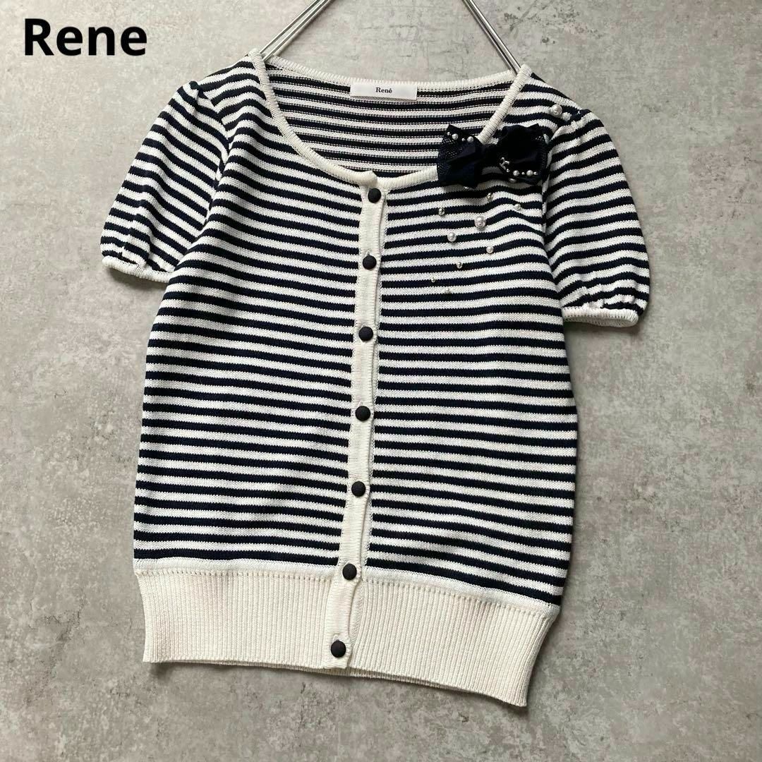 - ルネ 半袖ボーダーニットカーディガン りぼん ブローチ付き ビーズ ネイビー ホワイト 日本製 34サイズ Rene