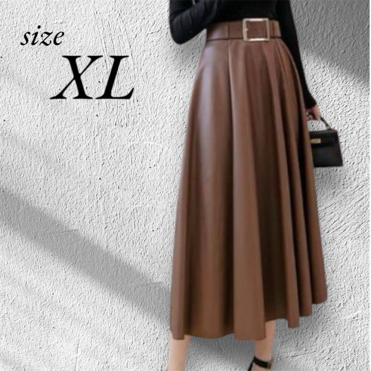 - レザー スカート ブラウン XL Aライン ミモレ丈 ベルト付き