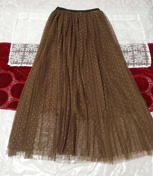 > 茶色水玉マキシチュールロングスカート Brown polka dot maxi tulle long skirt