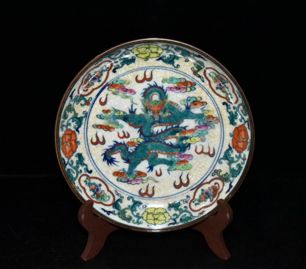 > 『館蔵珍品 清 康熙年製款 古陶瓷品 霽紅釉 斗彩 開片 龍紋 供盤』置物 賞物 貴重物品 収蔵品 中国古美術