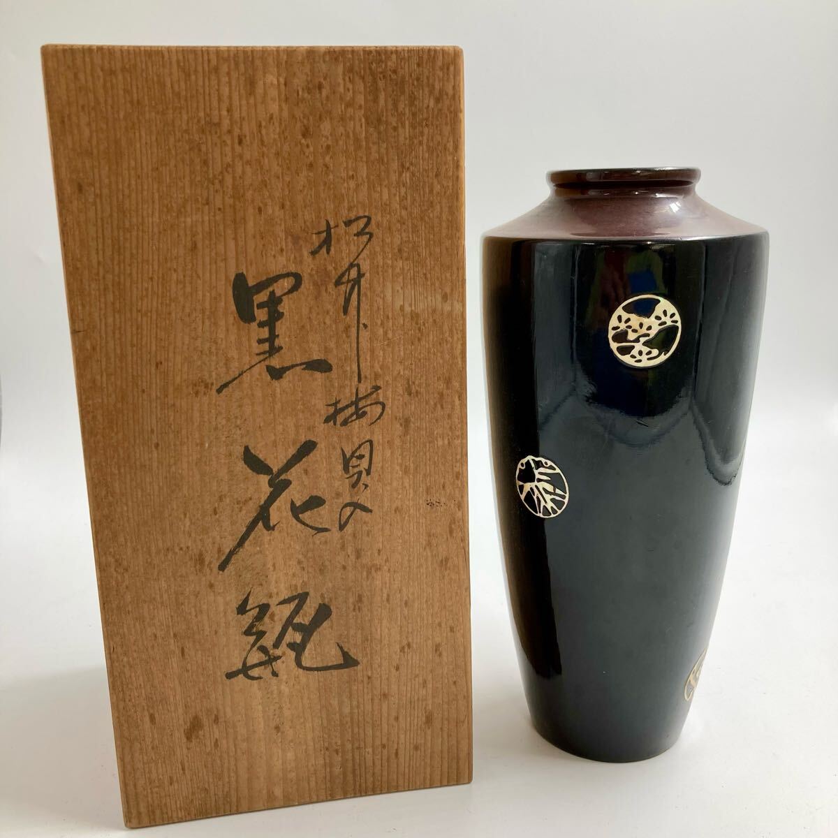 - G655 黒花瓶 黒花器 深川製磁 花生 インテリア 壺 花入 作家物 伝統工芸 共箱付 白蝶貝