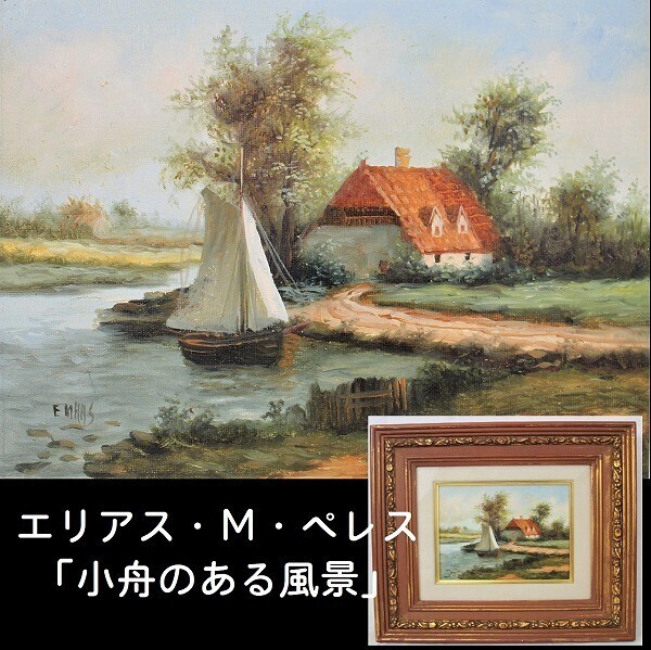 > 【真作】 エリアス・M・ペレス「小舟のある風景」 油彩0号 スペインの作家 伝統手法による重厚感 リアリズム D184