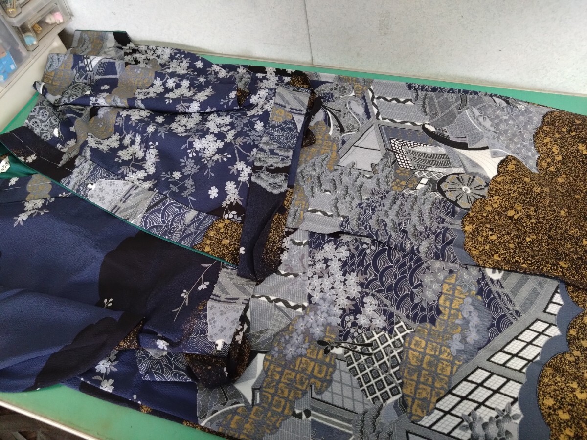 - ●118 しょうざん 着やすい 二部式 着物 ポリ縮緬 紺色 金彩 人物 桜 松 御所車 優美 柄 作務衣 風 レディース M しつけ糸付 未使用品 ③