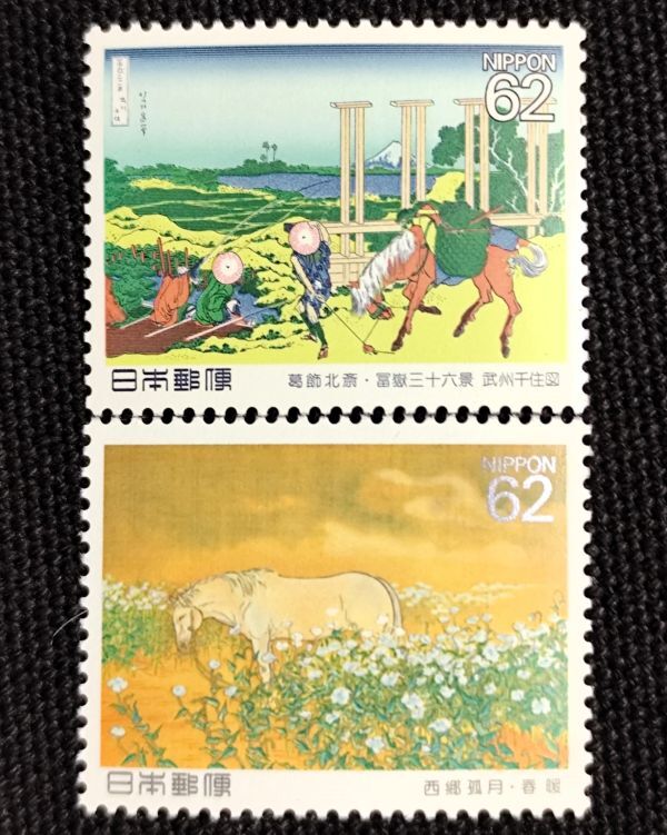 - [25040925]【馬と文化シリーズ 第5集】単片2種完「冨嶽三十六景 武州千住図 葛飾北斎・春暖 西郷孤月」62円×2 1991年発行