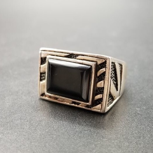 > オニキスレクタングルカット 925シルバー ヴィンテージ シグネット リング 銀 指輪 アールデコ装飾 ウェーブ ヘビー メンズジュエリー R8-C