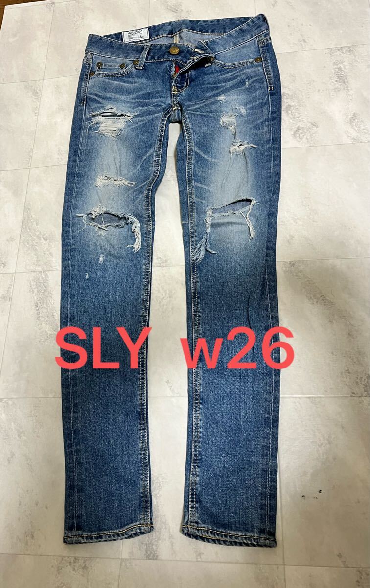 - SLY スライ クラッシュダメージデニム 26インチ ブルー ストレッチ スキニー ジーンズ ダメージ 丈長め