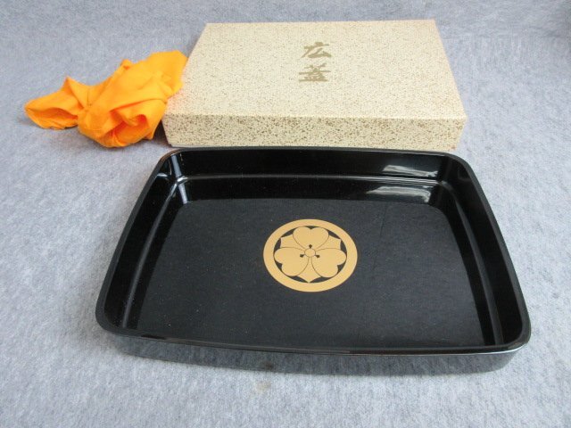 > 越前塗 黒塗 丸に剣片喰紋 広蓋 [B27762] 高さ5.5cm 縦28.5cm 横40cm 長方盆 漆器 茶道具 菓子器 古美術 古玩 骨董