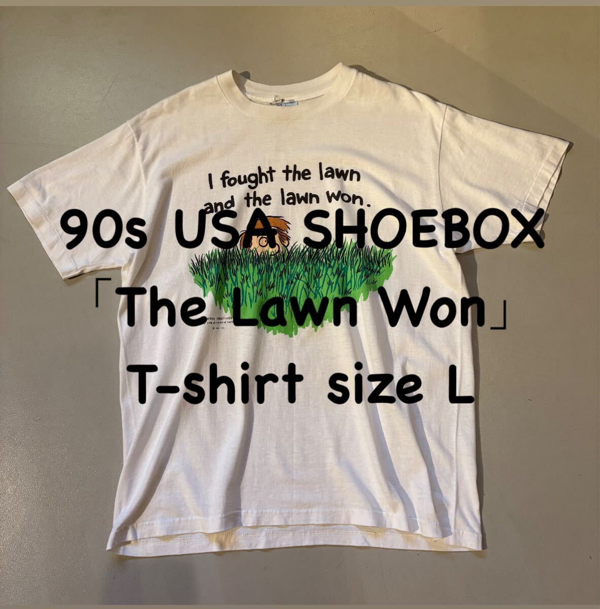 > 90s USA SHOEBOX 「The Lawn Won」 T-shirt size L 芝生 草刈り ポップ アート90年代 半袖 tee 白