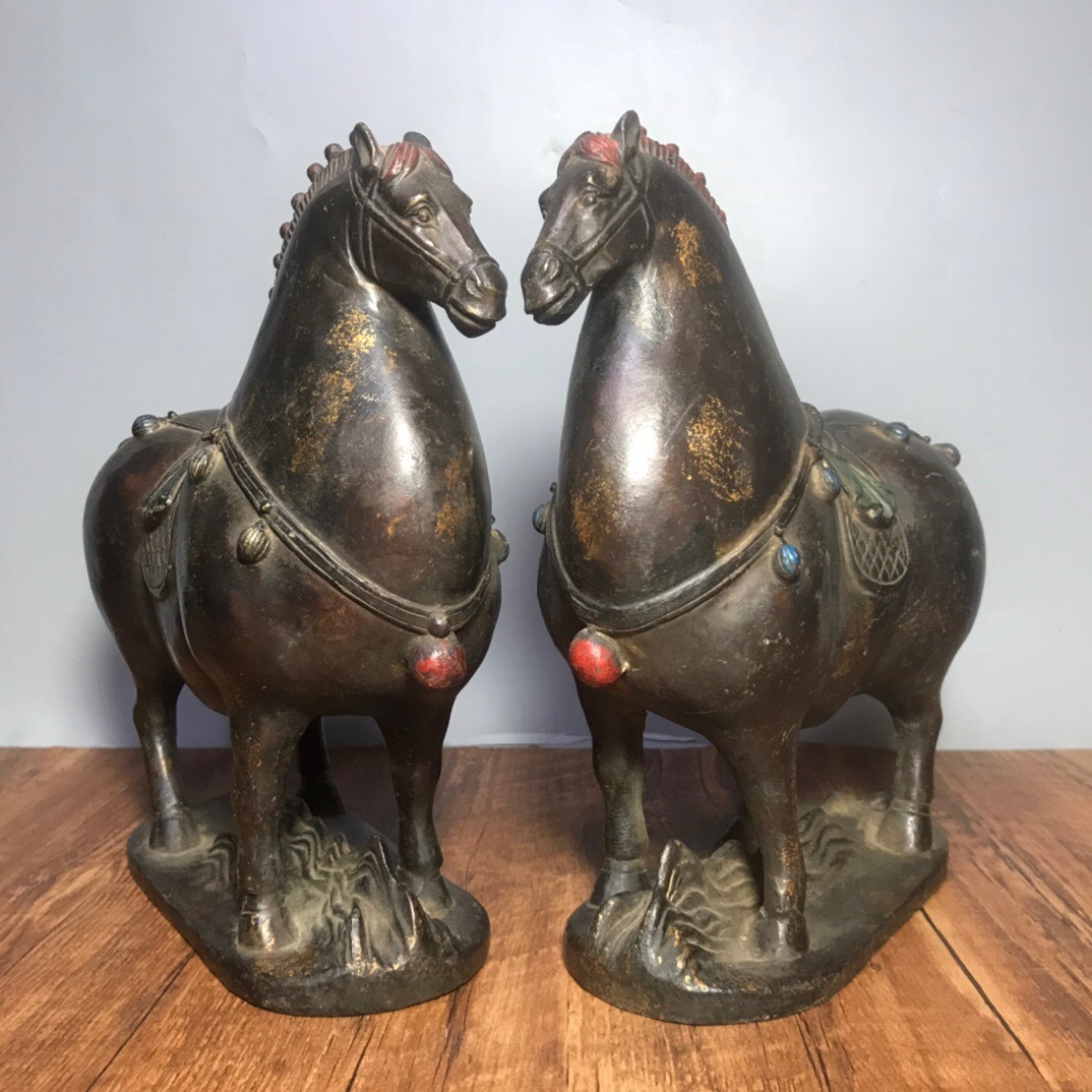 - 【超珍館蔵】銅製 泥金 朱砂 馬到成功一對 置物 賞物 古賞物 古美術品 稀少珍蔵品
