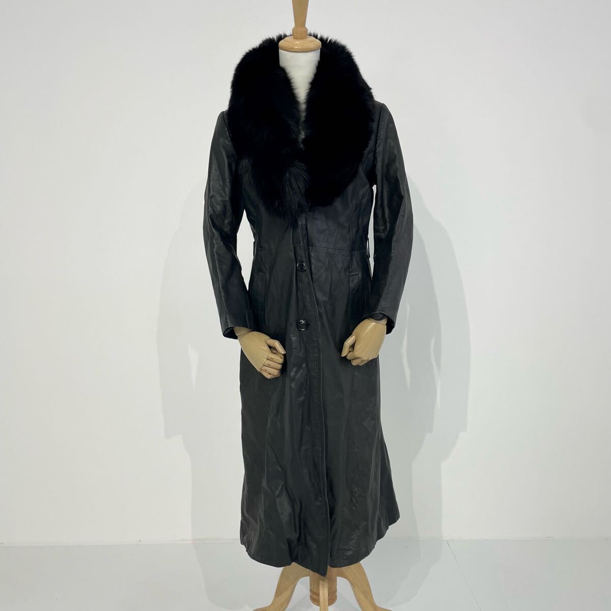 > Vintage 日本製 80-90s Unknown 牛革 カウレザー 本革 ファー リアルレザー レトロ ブラック 黒 ロングコート
