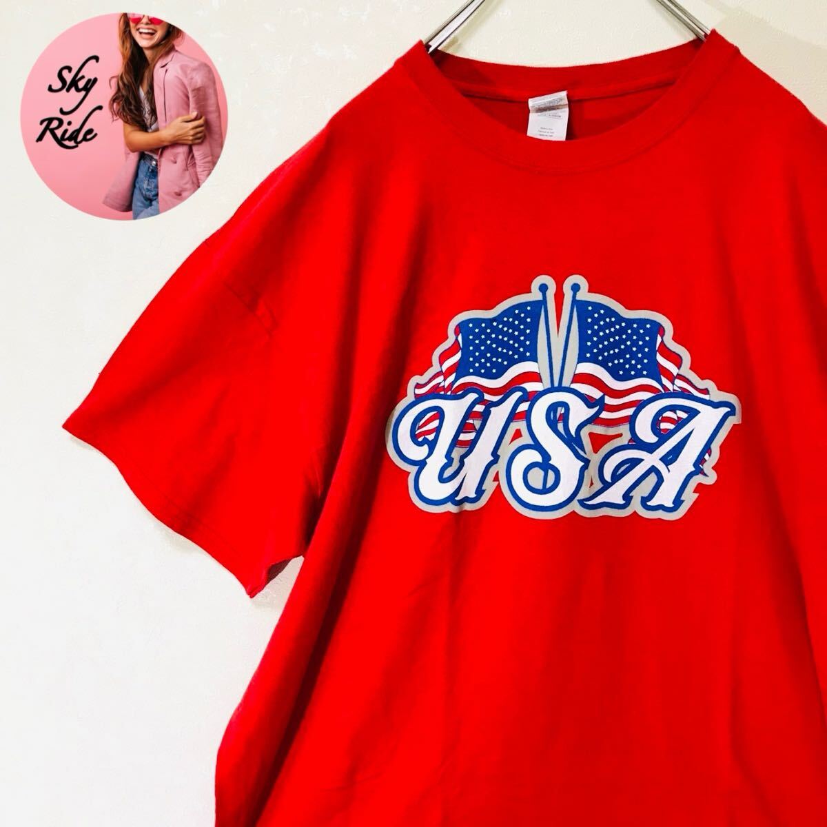 - GILDAN ギルダン メンズ 星条旗 USAロゴ ビッグプリント ヴィンテージ 半袖Tシャツ レッド XL ビッグシルエット 古着 #TT0174