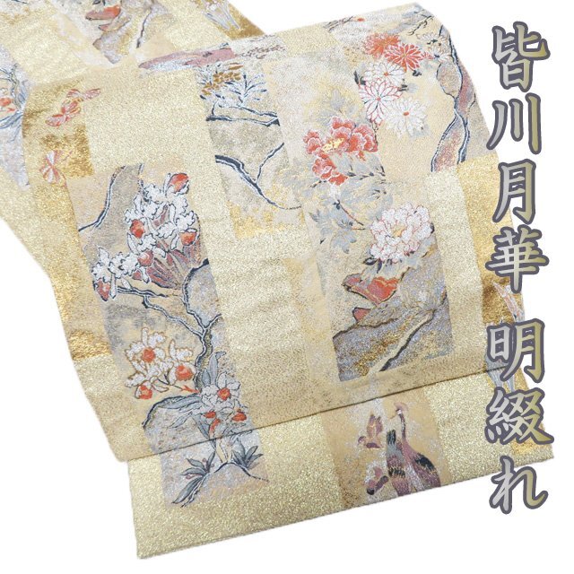 > 特選 袋帯 中古 リサイクル 正絹 フォーマル 仕立て上がり 六通 皆川月華 落款 明綴れ 色紙に花鳥模様 箔糸 多色 金 きもの北條 A1178-17