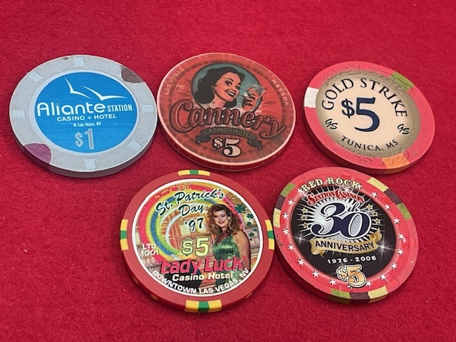 - C-33現状品 チップ 入手困難 本場海外 ラスベガスなど ヴィンテージ カジノチップ $5など ポーカーチップ ゴルフマーカー5枚セット