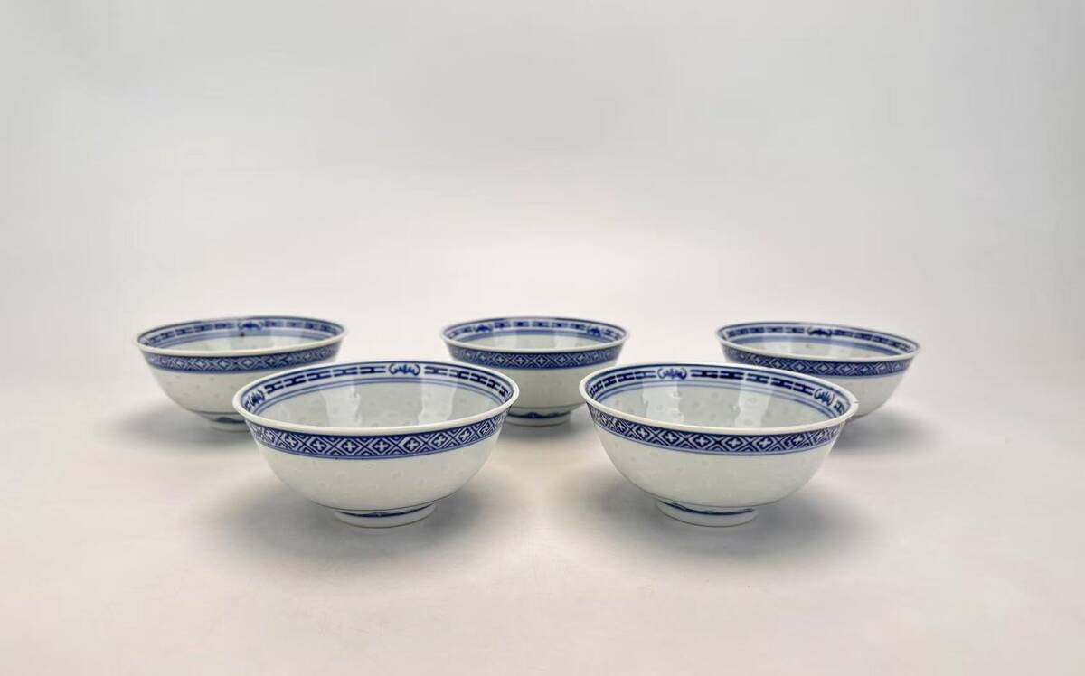 > F44★中国 景徳鎮製 青花玲瓏碗 蛍焼 茶杯 5客 菊紋 茶碗 蛍手 茶器 青華 透かし 青花 染付 碗 煎茶碗 在銘 現状品