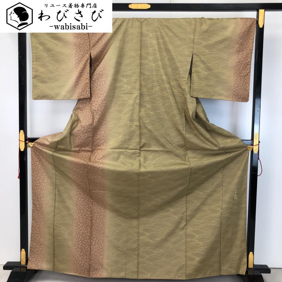 枯草色ベースの落ち着いたお色味、縦縞に小花模様の柄裄がデザインされた素敵なお品でございます。