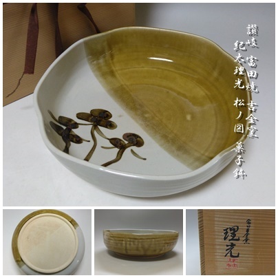 - 【T-355】讃岐 富田焼 吉金窯 紀太理光 「松ノ図」菓子鉢 共箱付 茶道具
