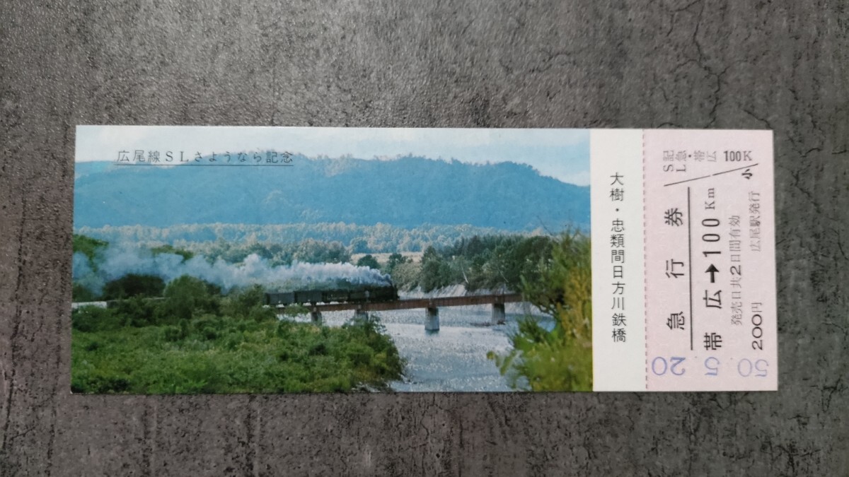 - 広尾駅発行「広尾線SLさようなら記念」急行券 帯広→100km