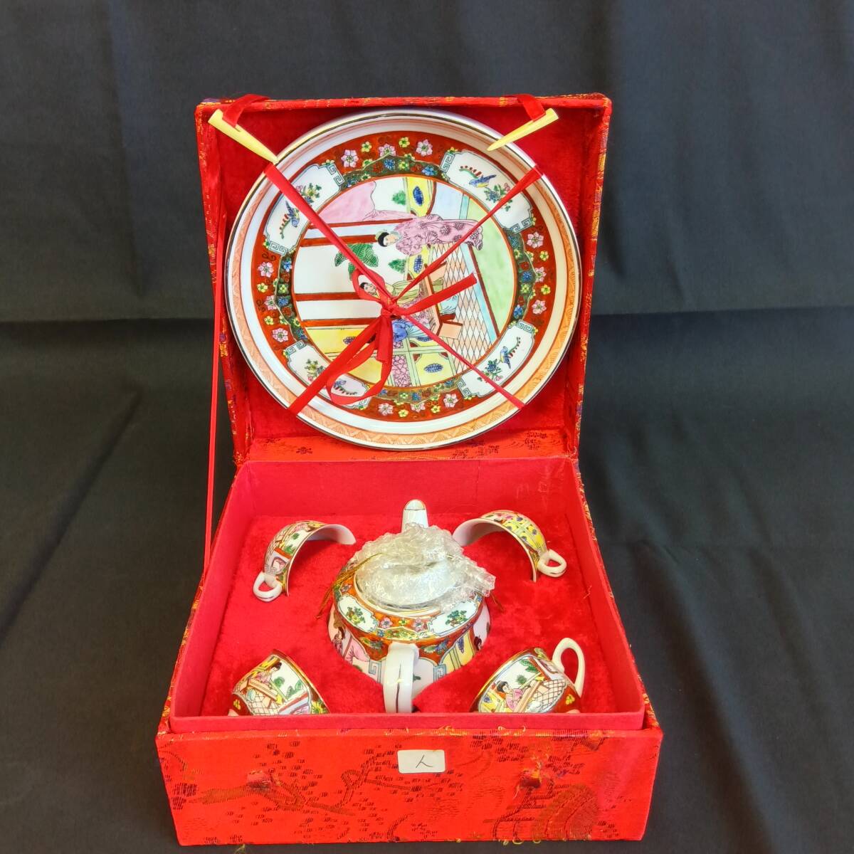 - 中国景徳鎮 茶器セット 急須 湯呑 茶碗 プレート付き 美品 化粧箱入り 高級磁器 骨董 アンティーク 工芸品 民族柄 飾り茶器セット