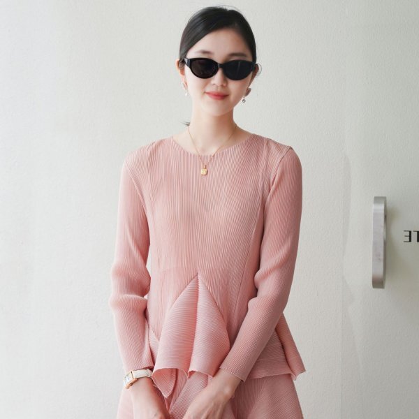 - 2504レディーストップスプリーツpleats長袖シャツブラウス肌触り弾力ドレープ性がいい大人可愛いピンク