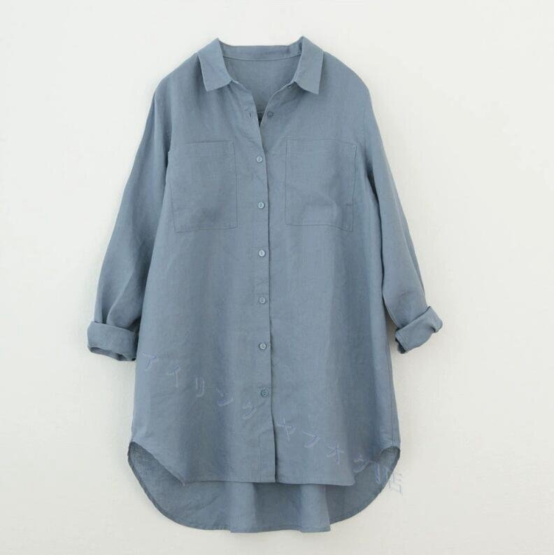 > 春 レディース シンプル ゆったり 無地 リネン 長袖 シャツブラウス 大人 チュニック ブルーM-2XLサイズお色選択可