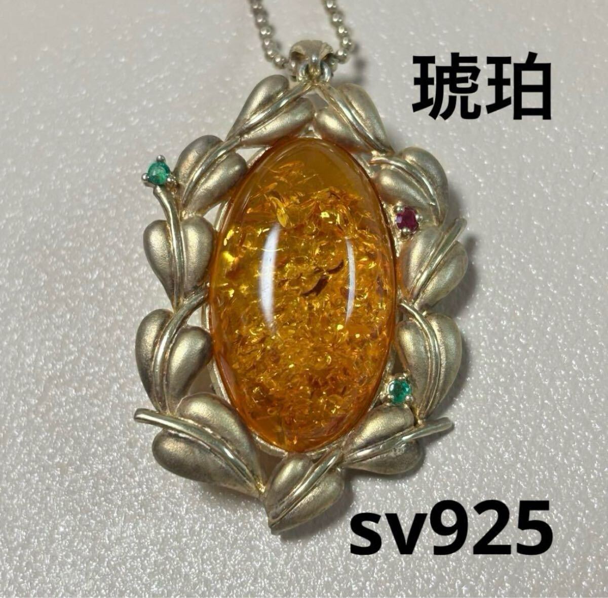 - 美品◇琥珀×天然石 ゴールドネックレス◇彫金◇アンバー◇SV925