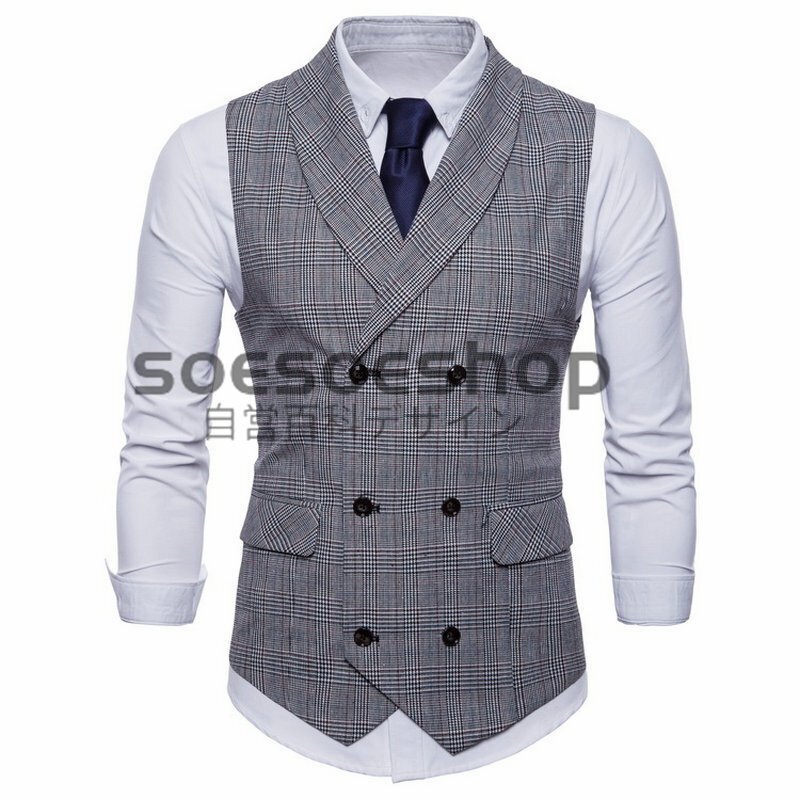 > ジレベスト メンズ スーツベスト チェック柄 shawl collar襟付き ビジネスベスト フォーマル結婚式スリム 通勤 M~4XL ライトグレー 選択3XL