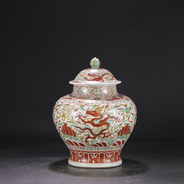 - 明時代 嘉靖 紅緑彩海水雲龍文大蓋罐 唐物 箱付き 陶磁器 中国美術 古美術 置物 高さ41.5cm 口径17cm 胴径30.5cm RG863