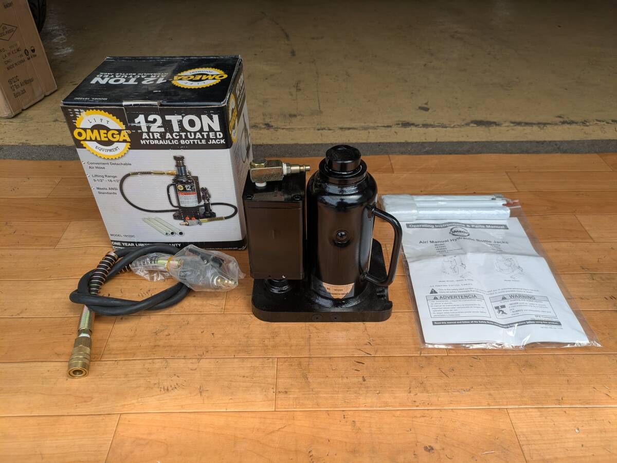 - No.633●エアジャッキー●油圧ボトルジャッキ●未使用品●OMEGA●12TON●エア作動式●18122C●便利な脱着式ホース付き●オメガ