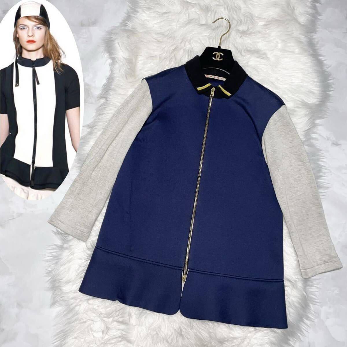> 本物 マルニ 切替 デザイン 裾フリル 七分袖 ダブルジップ ジップアップ スウェット ジャケット 36 ネイビー×ライトグレー系 MARNI