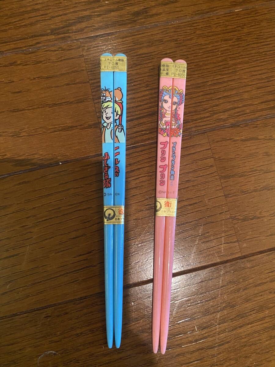 - 当時物 未使用 箸 2個セット 『ふしぎの旅』『プリンプリン物語』 汚れあり KK4968