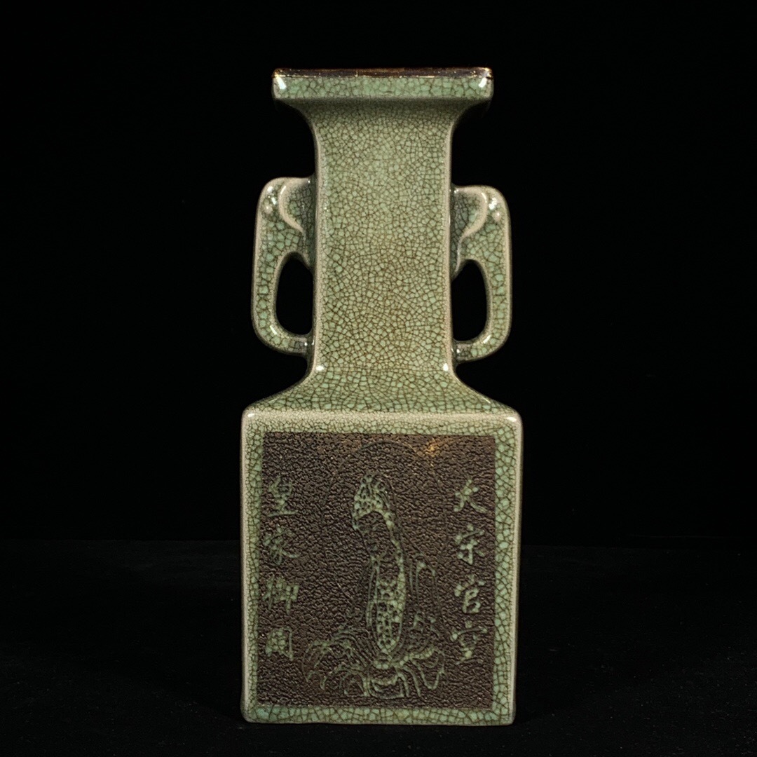 - 『館蔵珍品 宋 古陶瓷品 汝窯 包口 銘文觀音紋 雙耳四方瓶』置物 賞物 貴重物品 収蔵品 中国古美術