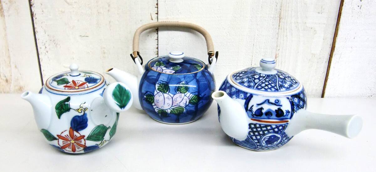- *伝統工芸 工芸品 茶道具 *急須 お茶入れ 3点まとめ セット *有田焼 常右衛門 ほか 銘入*花柄 風景紋 朝顔模様*茶器 茶道 時代 古物