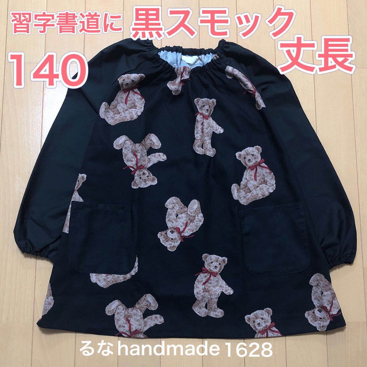 - 習字書道に黒スモック長袖140テディベア柄*るなハンドメイド*くまさん ブラック 可愛い女の子用 子供用割烹着エプロン 新品即決送料無料