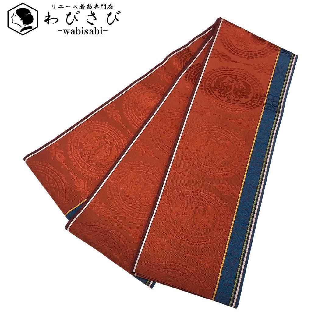 - 半幅帯 本場筑前博多織 縦縞模様 丸に向かい鳥 花唐草模様 紅柿色 D-2058