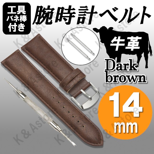 - 腕時計 ベルト バンド 14mm 本革 牛革 レザー バネ棒付き 無地 交換用 バネ棒外し 工具付き バンド レディース 女性 茶 ダークブラウン