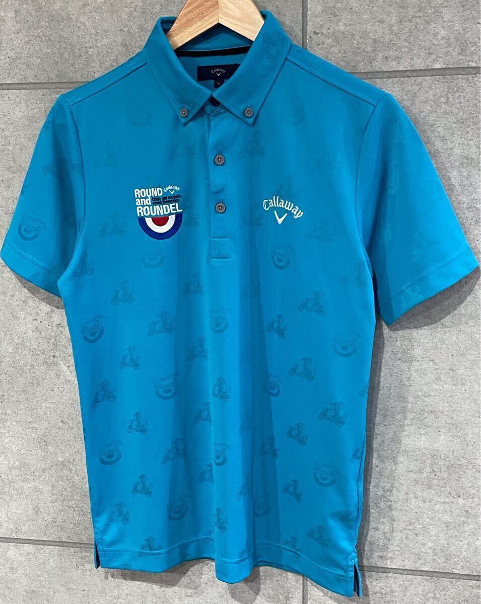 - 夏本番! Callaway キャロウェイ 吸汗速乾 半袖ポロシャツ ボタンダウン 総柄 ブルー系 Mサイズ ゴルフウェア レターパック可 ○ 新規×